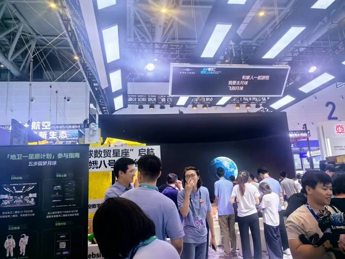 数贸会主展馆的数智未来主题展区,地卫二空间技术(杭州)有限公司展台,顶棚的屏幕上“我要去月球”、“和家人一起游览”等字幕依次划过。